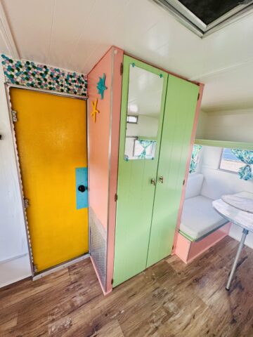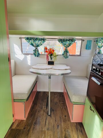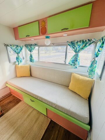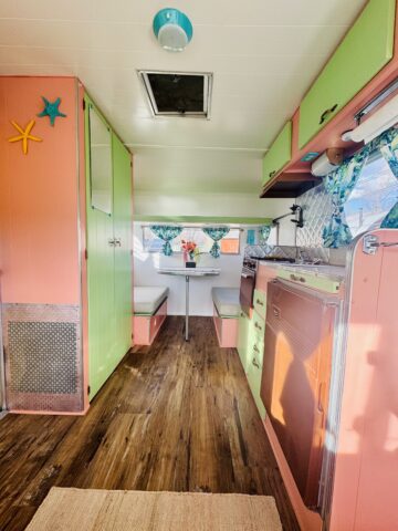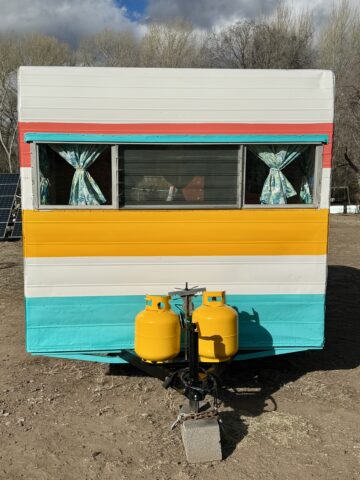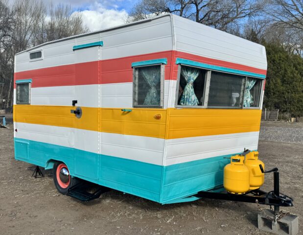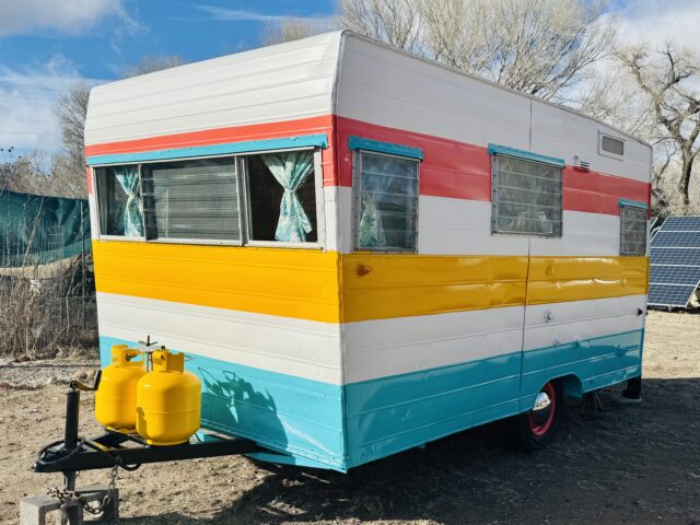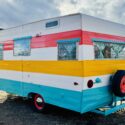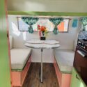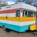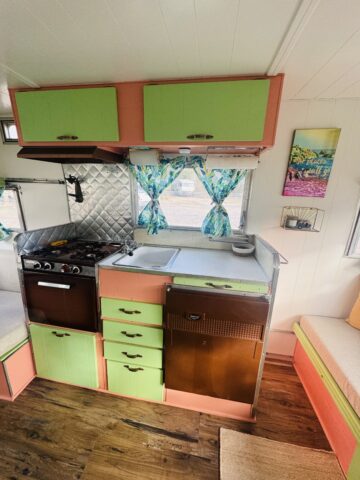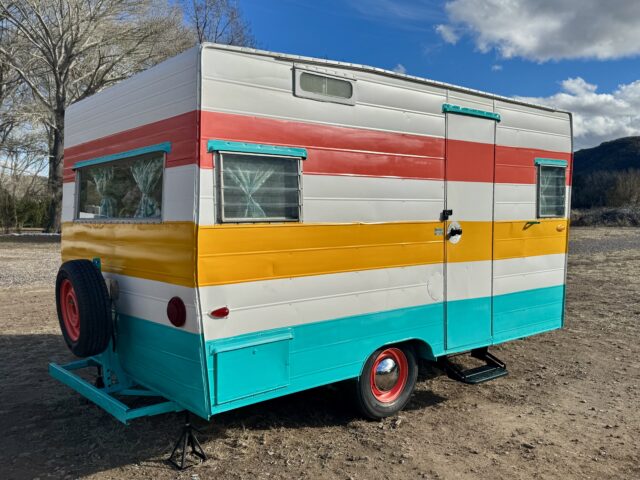 We are selling our classic vintage 1964 15ft Aristocrat Mainliner. She has been customized with newer updates such as: custom exterior paint job, custom interior paint job, brand new Porta-Potty, new flooring throughout, new upholstered cushions, new curtains, and added trailer brakes. Lots of storage throughout for this cutie. All upgraded 110V lighting fixtures along with battery operated LED lighting for dry camping. Sleeps 5 comfortably depending on size of person with bunk bed, sofa bed, and the booth makes into a bed as well. Original ice box and stove/oven work great! A simple custom island theme was chosen for this little island treasure. We strive to maintain the integrity of the vintage originality while giving her “new life” by adding updated custom features throughout.