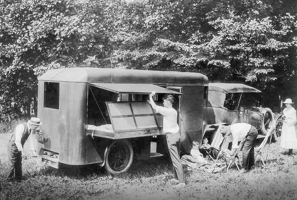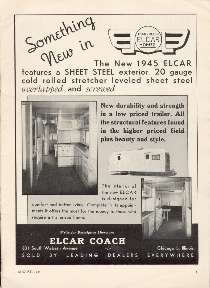 Elcar Coach was started by Milo Miller around 1934. Miller had started building trailers in Mishawaka, Indiana in 1931 under the name Sportsman Trailer Company. Miller was a pioneer in the early trailer days, building his first trailer out of necessity to carry his family on business trips. After he sold his first trailer, he saw demand and quickly built more.  Wilbur Schult saw Miller’s trailers at the 1933 Chicago Exposition Show and bought the Sportsman Trailer Company from him in 1936. This would later become Schult Homes, one of the biggest manufactured home builders today. See https://tincantourists.com/wiki/schult/ for more info on Schult trailers. After this sale, Miller went on to start the Elcar Coach Company, and moved the factory to Bourbon, Indiana. In November of 1944, Elcar Coach was sold to Mid-States. Miller would stay in the trailer manufacturing business by starting the National Trailer Corporation with a factory in Elwood, Indiana. Less than 2 months after the acquisition, the Elcar factory had a devastating fire on Dec 24, 1944 and it burned to the ground.