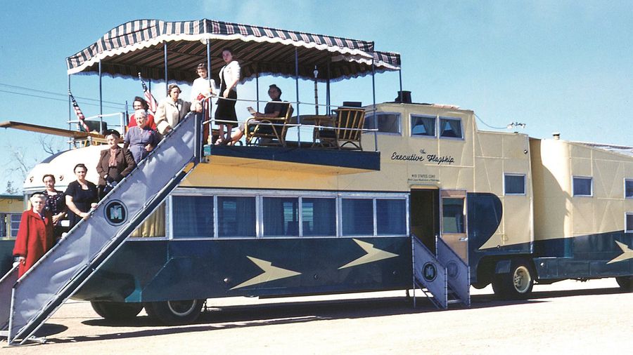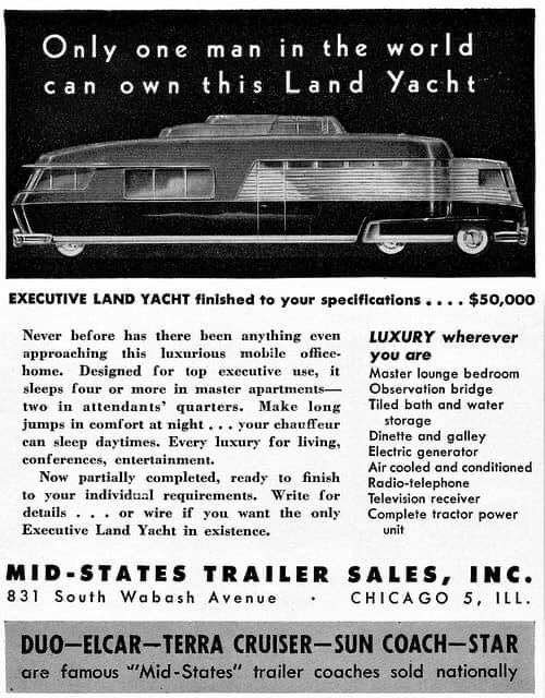 Always innovating and trying to be on the front line of design, Mid-States built special one-off units for promotions and shows. Some of these units include the Mid-States Executive Land Yacht, the Duo Flagship, and in the early 50’s, the Executive Flagship Coach.