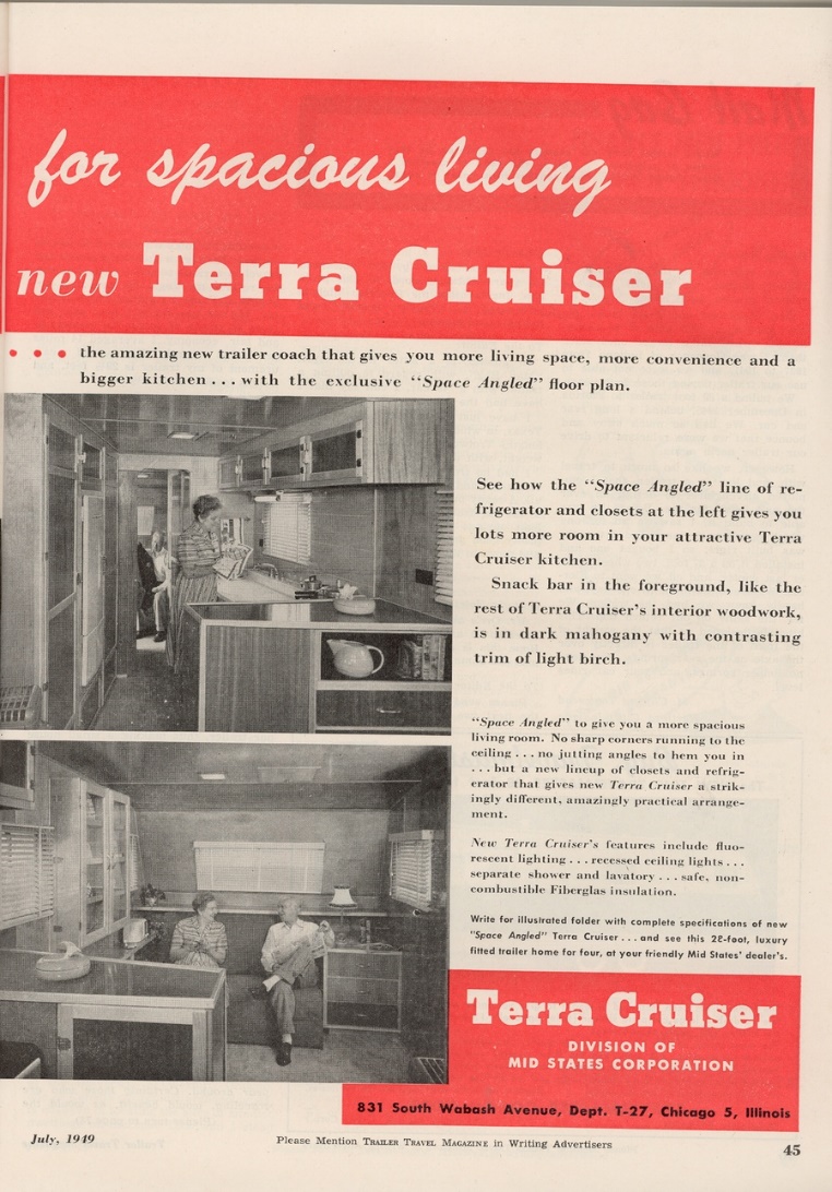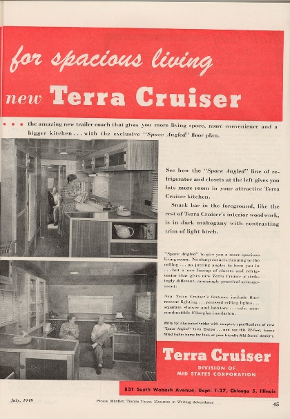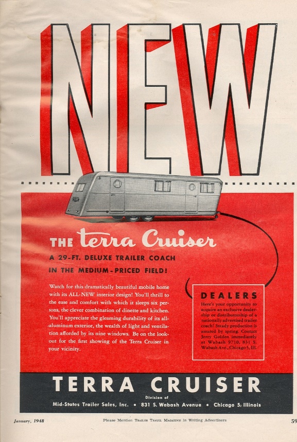 In 1947, Mid-States acquired a factory building in Cassopolis, Michigan from American Coach. This factory was used to start a new brand called the Terra Cruiser. They produced a 26’ aluminum model. This trailer was a former Duo trailer and was not the same as Terra Cruiser in California. They also produced the Star, the 19.25’ model. Unfortunately, in September of 1947, a fire broke out in the Cassopolis factory, burning it to the ground, and it was never re-opened. Production continued in both the Bourbon and Union City factories.