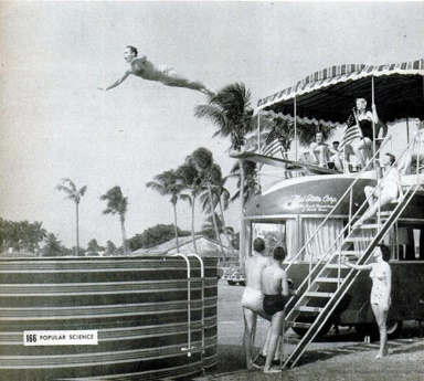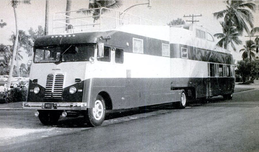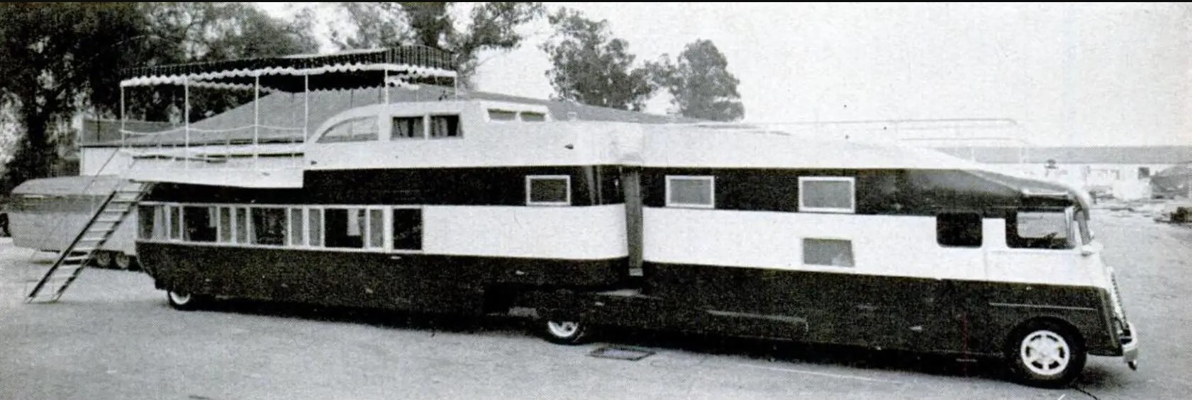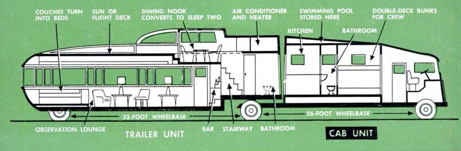In 1952, Mid- States built the Executive Flagship Coach motorhome at the Pan-American factory. The Executive Coach was like nothing ever built before. Coming in at 65 feet long and weighing 18 tons, it was toted to be the “most exciting mobile home in the world.” Amenities included 2 full bathrooms, a bar and a lounge, sleeping quarters, and a combination sun deck/helicopter landing pad/swimming pool diving board. Yes, this coach even had its own portable 6-foot-deep pool that could be set up behind the coach. Only one unit was ever built and was last seen in the mid-60s rotting away in a St. Petersburg, Florida storage yard.