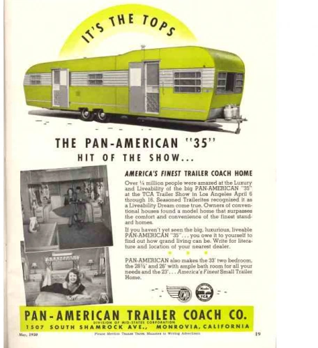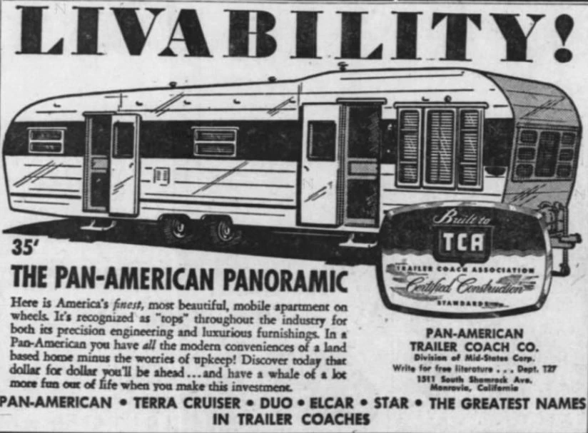 In 1949, Mid-States bought the Pan-American Coach company in Pasadena, California for nearly $1,000,000. The Pan-American factory was one of the most modern facilities in the business with a continuous production line running 1,020 feet with modern machinery. Pan-American Trailer Coach was founded in 1945 by Allen Brokate.